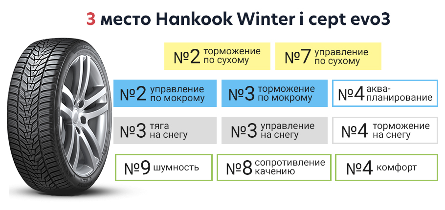 Хэнкук неплохо проявила себя, особенно в отношении аквапланирования, почти сравнявшись с летней шиной, которая лучше справлялась с торможением, чем с управляемостью.
