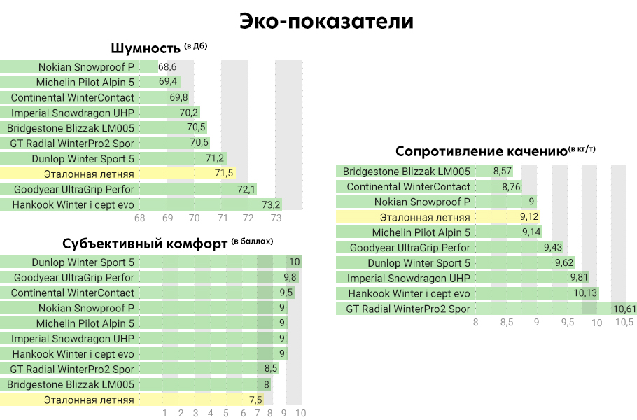 Самая тихая шина - Nokian; самые субъективно комфортные - Dunlop, Goodyear и Continental; самая эффективная топливная экономичность - Bridgestone и Continental, что впечатляет, учитывая их производительность.